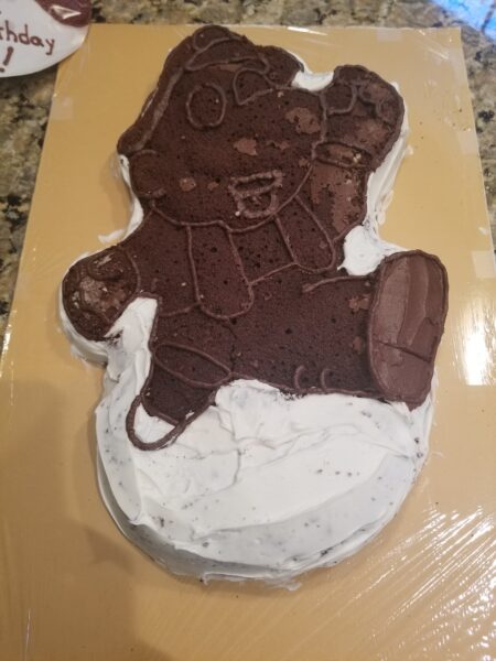 I buttered the mold thoroughly to ensure the cake came out in one piece, and that almost worked, with only a couple of small pieces having to be glued with frosting into place.