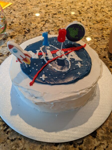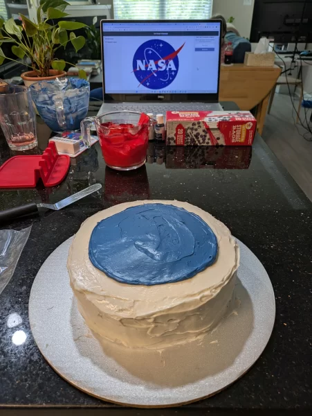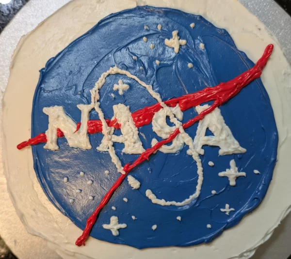 This year, he asked for a two-layer, chocolate, NASA cake. Can do! Here's my reference art.